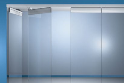Sliding folding glass partitions primarily designed for room dividers. The system comprises top-hung frameless toughened glass panels with top and bottom rails hinged together in units of two to eight panels. Floor guides are not required. Security bolts in top and bottom rails
