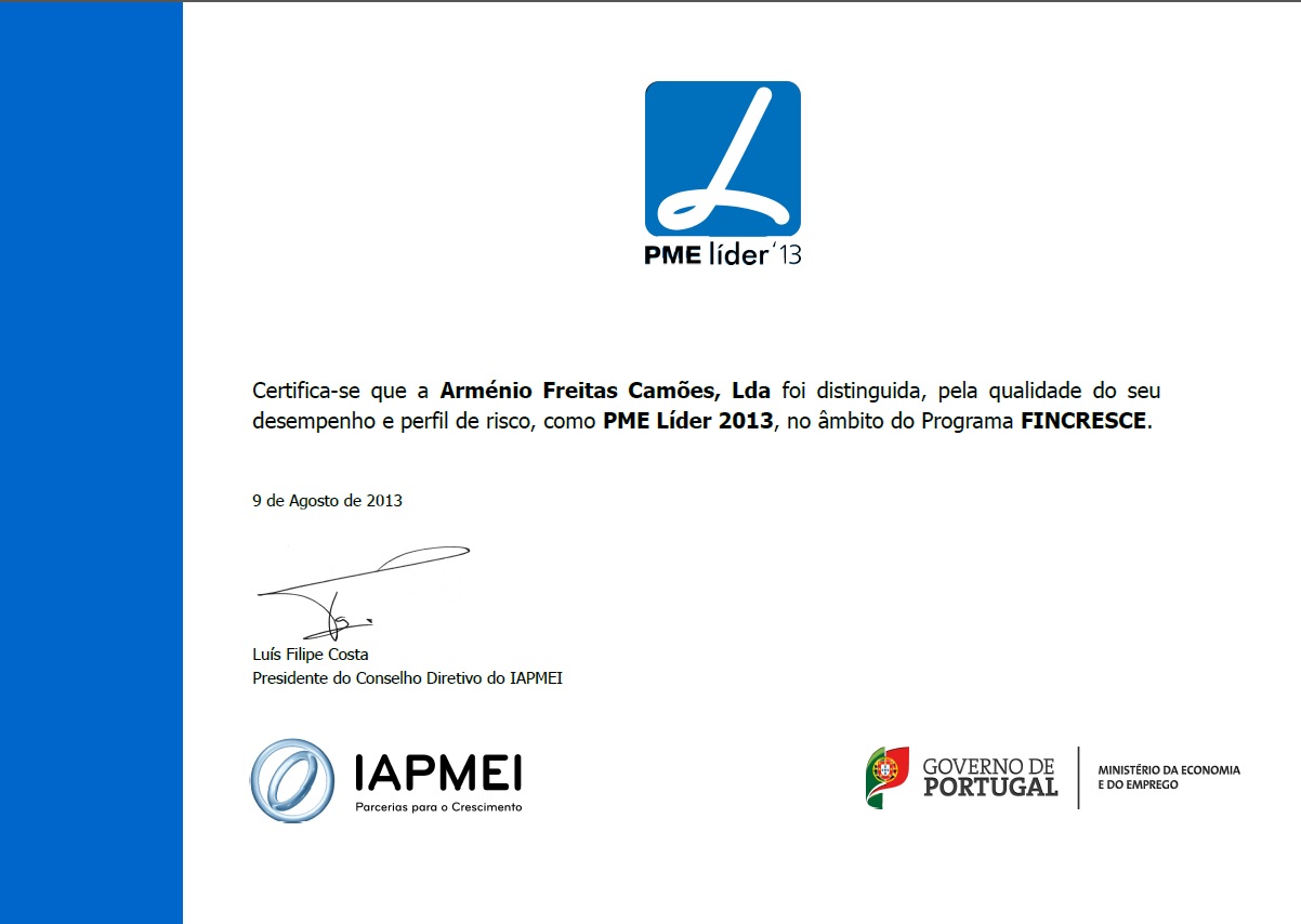 Pelo 3º ano consecutivo que a AFCAMÕES, LDA. é distinguida com o Estatuto de PME Líder, atribuído no âmbito do Programa FINCRESCE do IAPMEI, e que distingue empresas nacionais com perfis de desempenho superiores.