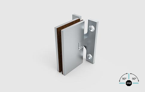 Dobradiça vertical para parede, com abertura nos dois sentidos e pontos de fixação a 90º. Usada em pequenas aplicações.