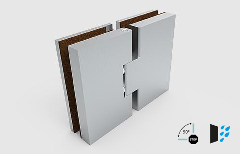| Dobradiça vertical para vidro fixo, com abertura num só sentido e ponto de fixação a 90º. Usada em pára-duche, proporciona vedação a 100 %. | |