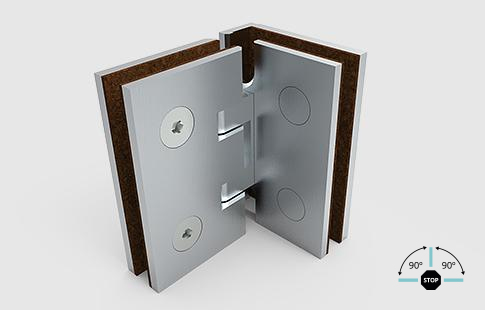 Dobradiça vertical para vidro fixo a 90º, com abertura nos dois sentidos e pontos de fixação a 90º.