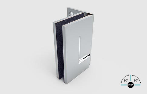 Dobradiça vertical de uma aba para paredeem inox escovado ou polido, com abertura nos dois sentidos a 90º e fecho automático a 25º. Máximo 50 Kg/porta (par). Para vidro de 8 a 12 mm.
