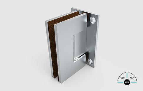 Dobradiça vertical para parede, com abertura nos dois sentidos e pontos de fixação a 90º.