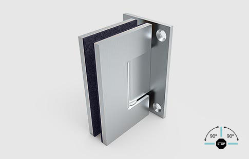 Dobradiça vertical para parede em inox escovado ou polido, com abertura nos dois sentidos a 90º e fecho automático a 25º. Máximo 50 Kg/porta (par). Para vidro de 8 a 12 mm.