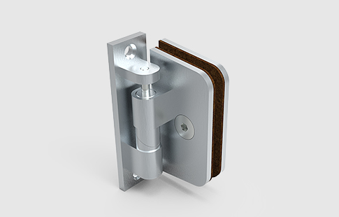 Dobradiça vertical com abertura a 90º e recuperação ao ponto zero. Com 15 mm livres na face superior para elevação do vidro na abertura.