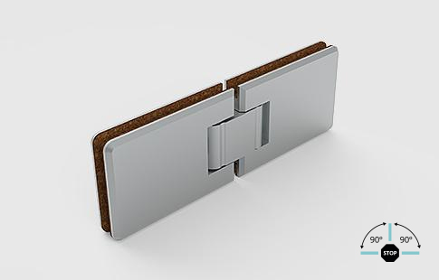 | Dobradiça horizontal para vidro fixo, com abertura nos dois sentidos e pontos de fixação a 90º. | |