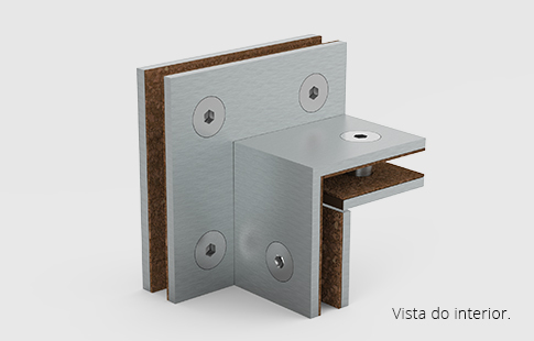 União de ligação para dois ou três vidros e dois contraventamentos interiores a 90º, sem batente.