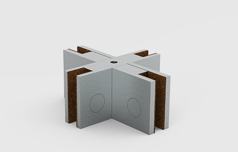 União de ligação de quatro vidros a 90 º em cruz, com fixação ao chão ou tecto.