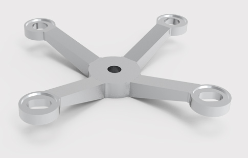 Aranha em aço inox AISI-316 para fixação central de quatro vidros, aplicada em fachadas de edifícios.