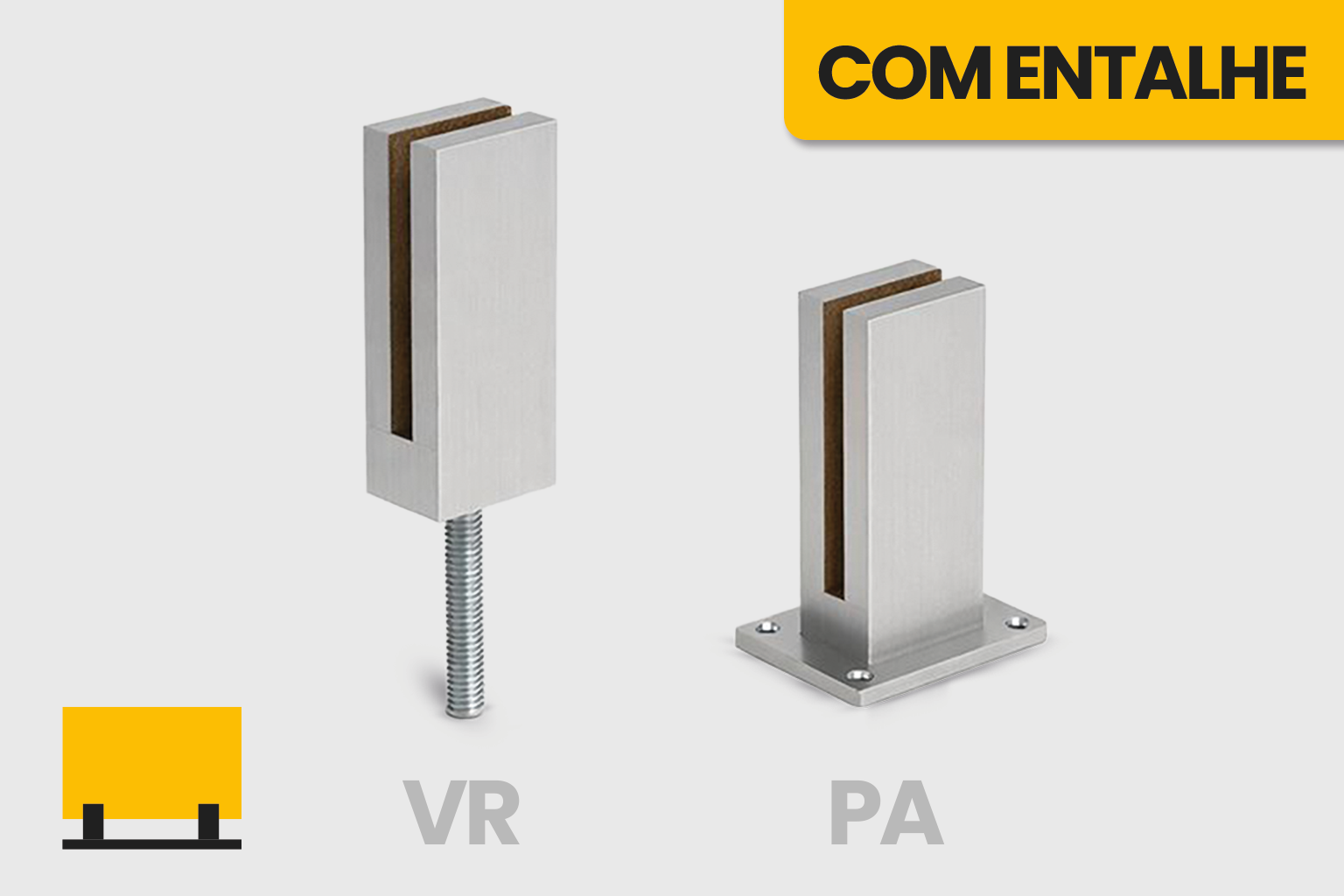 | Em barra 60x15 para vidro 12 mm. SUP-5302-VR-V12-60x15-150 / 60 x 150 x 44* mm. SUP-5302-PA-V12-60x15-150 / 100 x 150 x 80 mm. Em barra 60x12 para vidro 12 mm. Em barra 50x15 para vidro 12 mm. Em barra 50x12 para vidro 12 mm. *A profundidade varia com a espessura do vidro. |