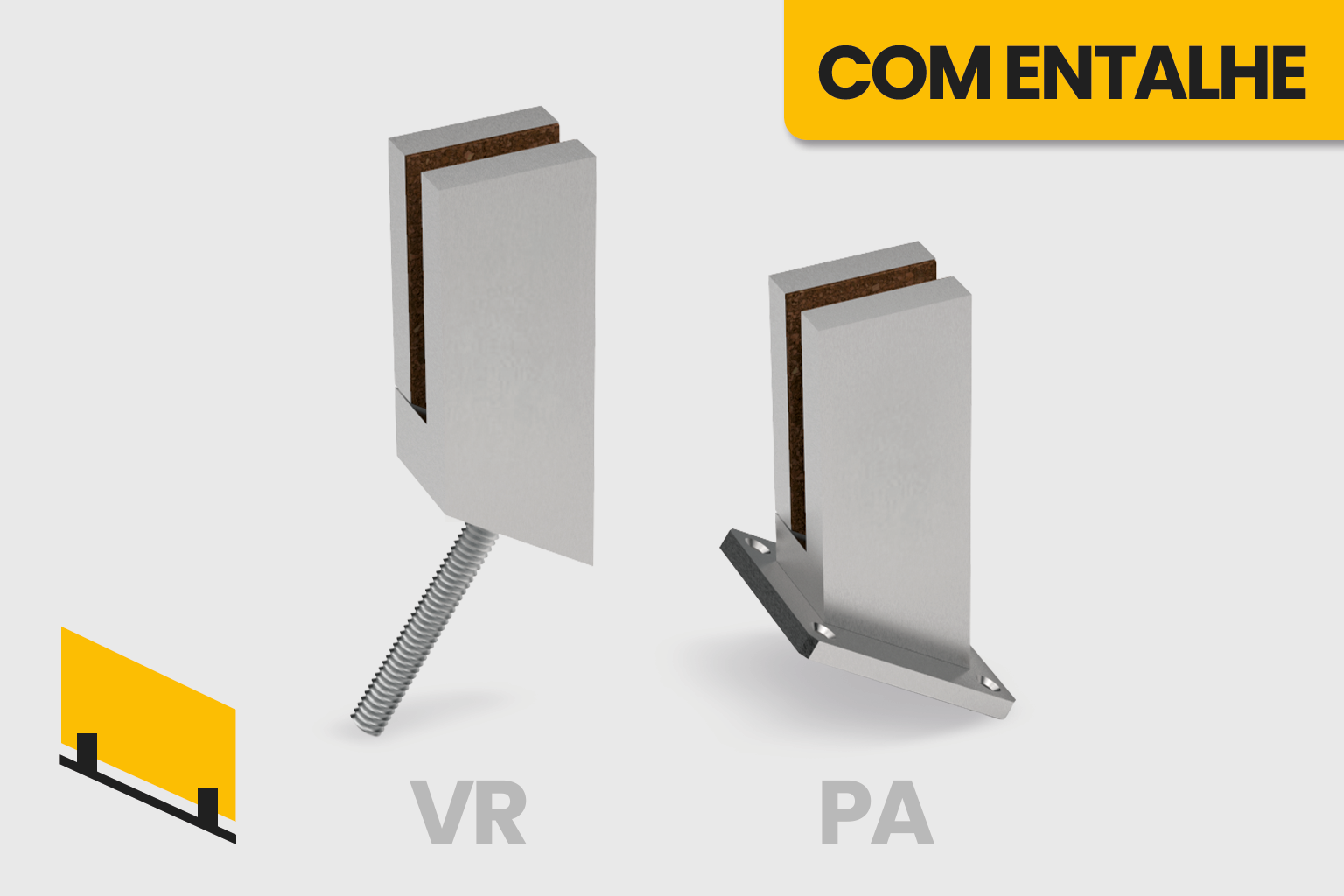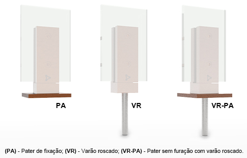 | Em barra 60x15 para vidro 12 mm. SUP-5304D/E-V12-VR-60x15-169 / 60 x 169 x 44* mm. SUP-5304D/E-V12-PA-60x15-169 / 83 x 169 x 80 mm. Em barra 60x12 para vidro 12 mm. Em barra 50x15 para vidro 12 mm. Em barra 50x12 para vidro 12 mm. *A profundidade varia com a espessura do vidro. |